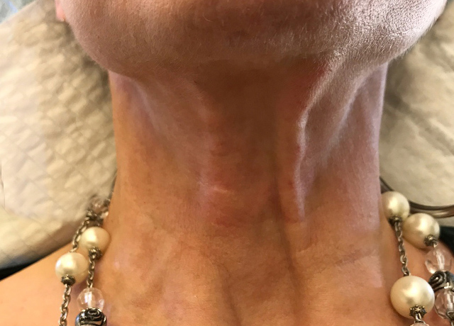 63 år. Tynd. Meget tydelige muskelbånd på halsen.
